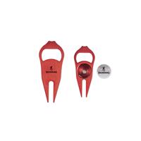 The divot tool with bottle opener has a removable magnetic ball marker and features a functional bottle opener. Available in black, blue and red.